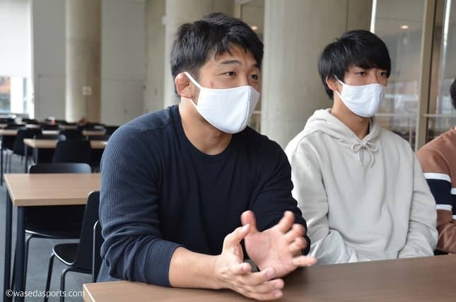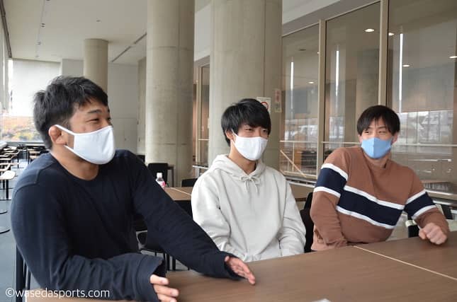 天皇杯全日本選手権直前対談・第1回に登場するのは、3年生ながらチームを盛り立てた安楽龍馬主将(スポ3=山梨・韮崎工)と米澤凌副主将(スポ3=秋田商)、そして最上級生としてチームを引っ張ってきた梅林太朗(スポ4=東京・帝京)の3人。自由な雰囲気のなかで、コロナ禍での活動や競技にかける思いを中心にお話を伺った。