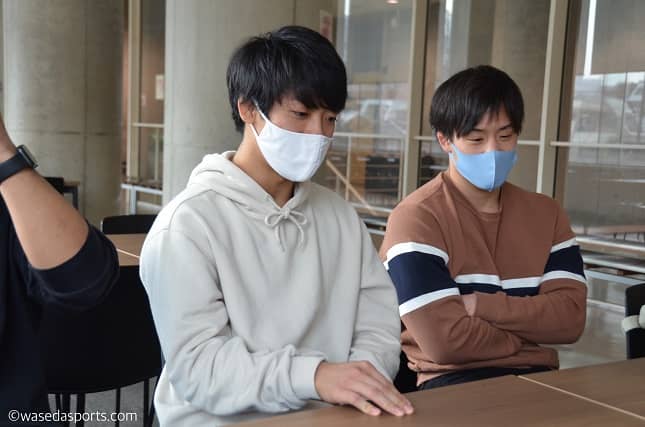 安楽 そうですね、俺は朝弱いですね。だから、今だから言えるけど、1年生のときにけっこう俺が寝坊していて、目立っていたんですよ。そんな中、こっち(米澤)とか彩天奈(小玉、社3=高知東)が寝坊してバレないっていう。それぐらい朝弱いっすね。