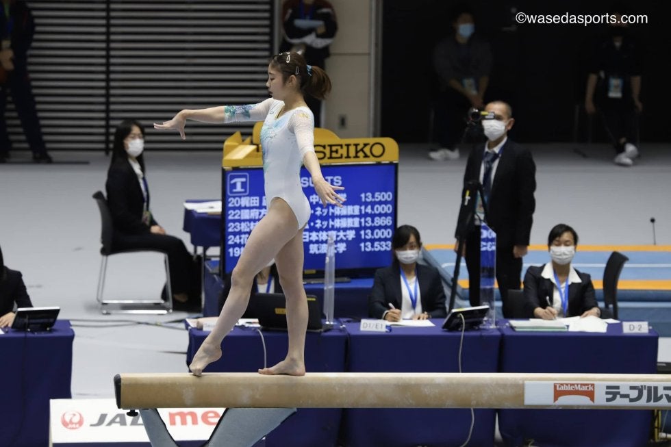 感染症拡大の影響で延期されていた個人総合と各種目別の日本一を決定する大会が、12月10日ついに開催された。本大会では予選上位24名が個人総合決勝に、個人通過者を除く各種目上位8位以内が決勝に駒を進められる。初日は女子の予選が行われ、早大からは内山由綺(スポ4=東京・帝京)が出場。跳馬を除く3種目で12点台と得点が伸び悩み、惜しくも決勝進出とはならなかった。