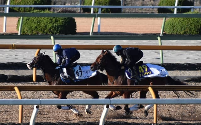ホープフルSへ向け1週前追い切りを行ったダノンザキッド(写真右、撮影:井内利彰)