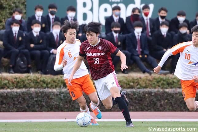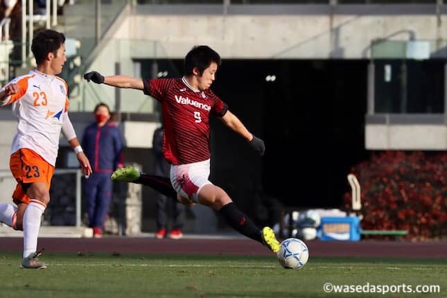 迎えた24分、攻勢に転じた中でルーズボールを法大に奪われると、インターセプトを試みた杉山の触れたボールが法大の足元に溢れる不運も重なり、ロングカウンターから失点。その後も前線からのプレッシングを、丁寧なパス回しと局面での個の能力で打開される場面が散見され、思うようなサッカーを繰り広げることができない。多くの時間で法大にボールを保持される展開に陥った中で45分、プレーが切れている際に早大選手が乱暴な行為を行ったとして1発レッドカード。退場の処分を受け、ビハインドにありながら数的不利を背負う厳しい状況となる。