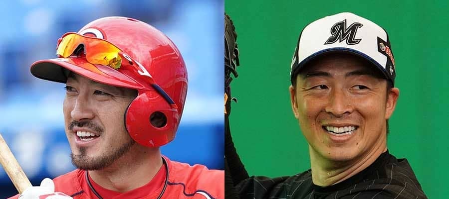 広島・菊池涼介(左)とロッテ・美馬学【写真:荒川祐史】