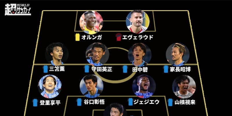 2トップには、得点王で今季MVPを受賞した柏レイソルFWオルンガと、そのオルンガに次ぐ18得点を挙げた鹿島アントラーズFWエヴェラウドが選ばれた。