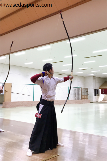 決勝トーナメントでは初戦の相手である熊本学園大の棄権により、2回戦からの登場となった。2回戦の相手は信大。初戦では17中と好成績を残している。それでも早大は、大前・田沼、参的・大澤暢(創理2=東京・早実)が皆中をするなど、チームを牽引。16中―12中と相手を引き離し、準々決勝進出を決めた。