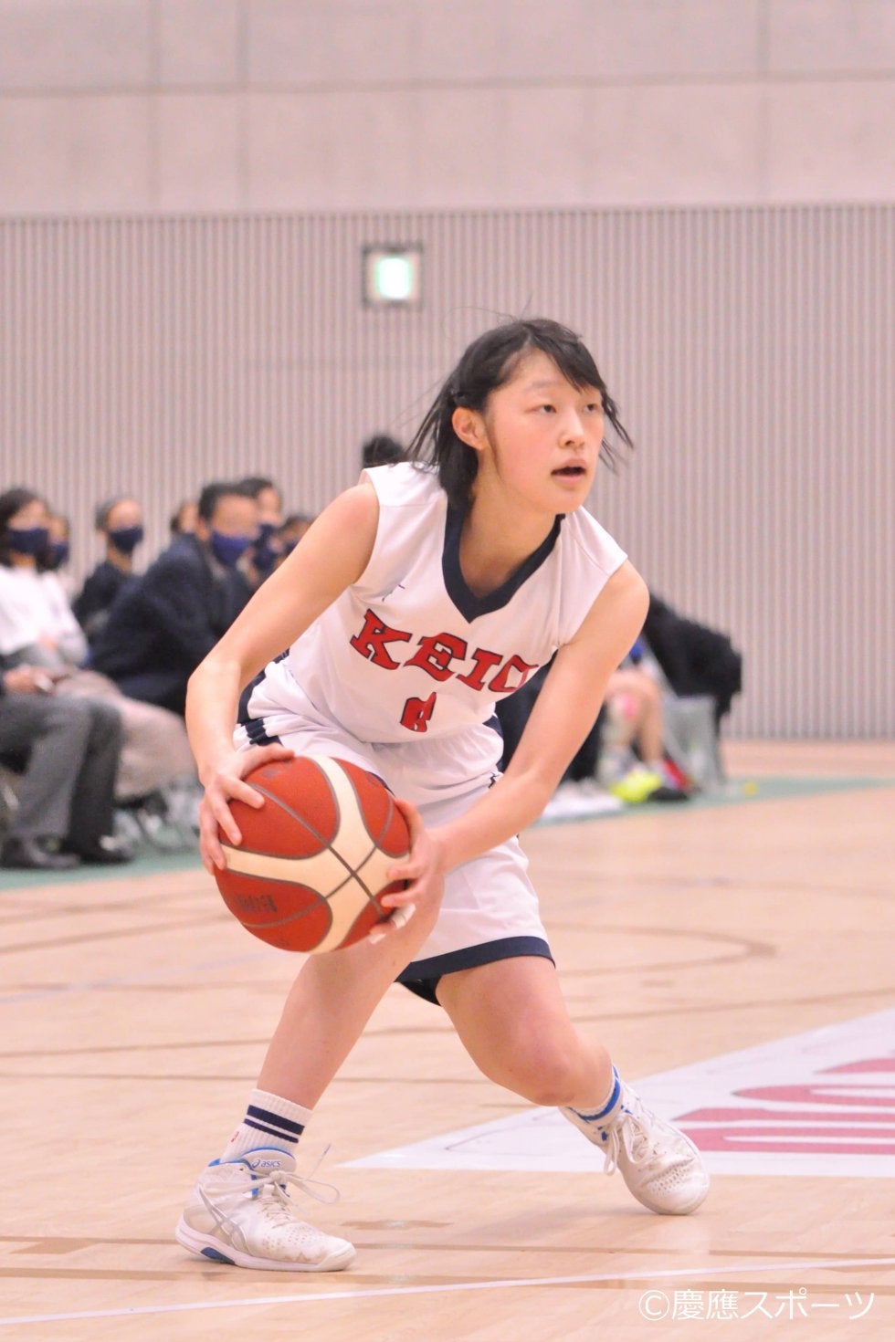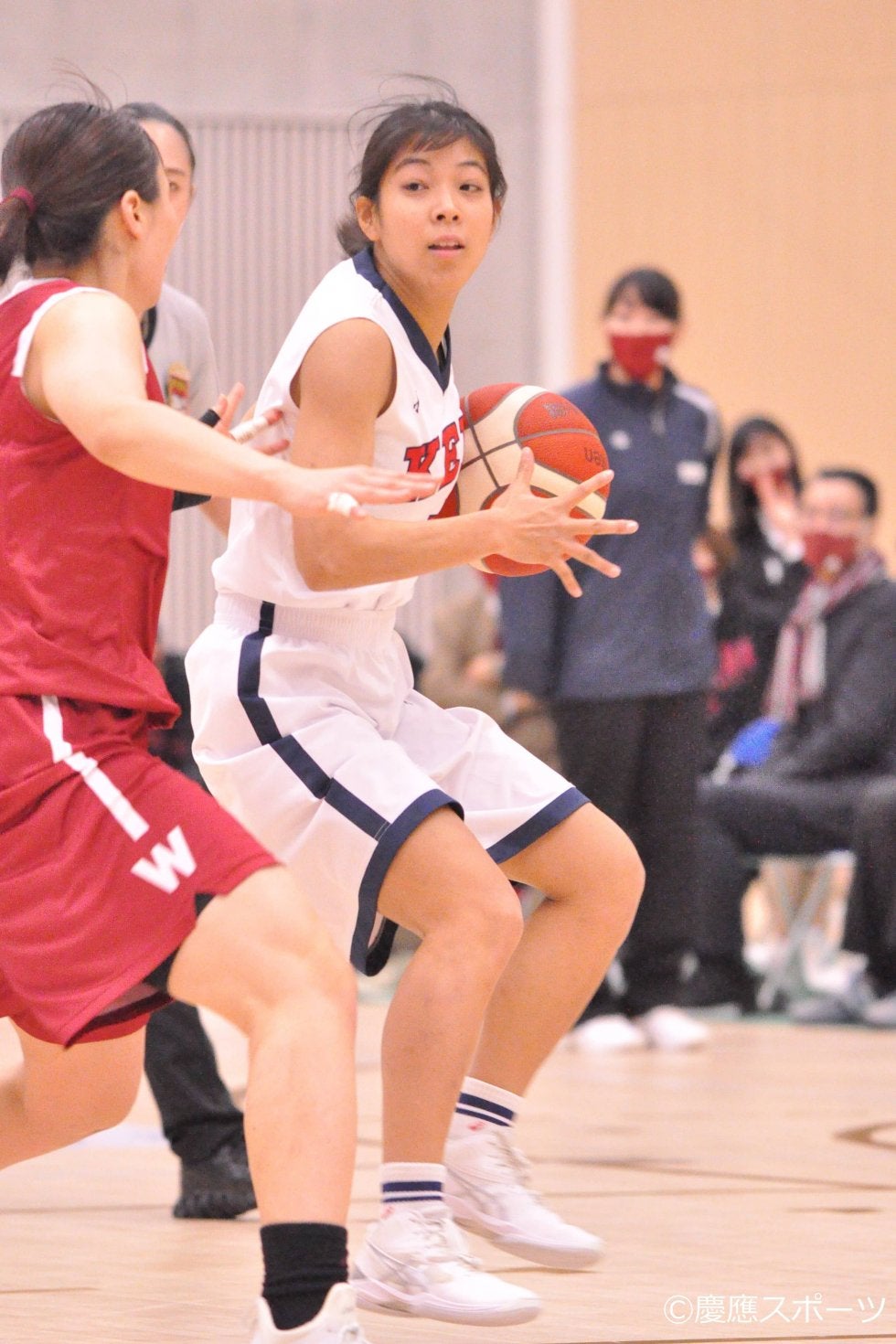 眞尾は抜群の安定感でチームに貢献第2Q序盤、第1Qの鬱憤を晴らすかのように、慶大の選手たちが躍動する。阿部七奈子(商1・三田)がミドルシュートを決めると、眞尾もレイアップを決め、早大相手に互角の戦いを見せる。その後も、眞尾が相手のファールで得たフリースローを正確に決め、得点を重ねていく。中盤に入ると西理奈(政3・葺合)もシュートを決め、チーム一丸となって早大に食らいつく。しかし、早大のタイムアウト明け、連続で5本シュートを許し、13―56で前半を終える。