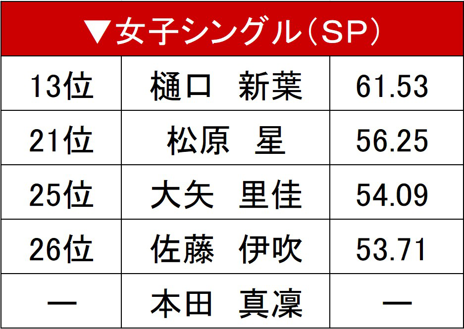 演技後、唇をかみしめて硬い表情を見せた樋口。「練習でも跳べていなくて少し調子が悪いと感じていた」。今シーズンを通じて挑戦し続けた演技冒頭のトリプルアクセル。NHK杯に続き今大会でもSPに組み込むも転倒。続く3回転のコンビネーションジャンプでも、うまくタイミングを合わせることができなかった。シーズン序盤から最初のミスを次に引きずらないことを意識してきただけに「次のジャンプをきっちり跳べなかった」と悔しさをにじませた。しかし、同じミスを二度繰り返さないのがさすがの樋口。続くトリプルフリップを成功させると、その後も見事な演技力で観客を魅了した。「切り替えて、開き直ったような感じで楽しく滑りたい」。2年連続の表彰台へFSでの逆襲を狙う。