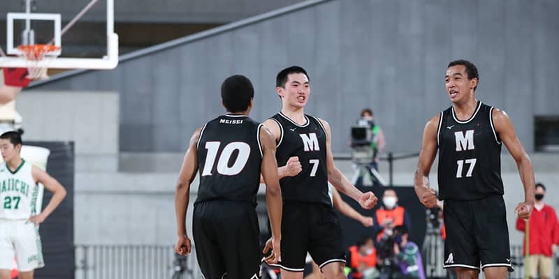 明成は(左から)山内ジャヘル琉人、越田大翔、山内シャリフ和哉ら3年生が力を発揮した [写真提供]=日本バスケットボール協会