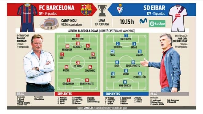 バルサの指揮官ロナルド・クーマンはレオ・メッシが欠場する中、前節のバジャドリード戦で試した3バックを再び採用する可能性があるようだ。ミンゲサ、ラングレ、アラウホが並び右サイドにはデスト。累積による出場停止処分が科されたジョルディ・アルバの代役はジュニオル・フィルポが務めるだろう。