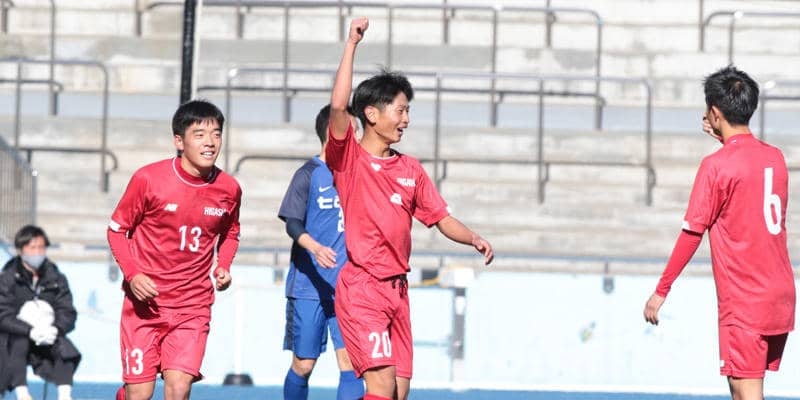 すると、東福岡はこの流れから一気にカウンターを仕掛ける。35分、MF青木俊輔⑦が左サイドからクロスを入れると、FW日高駿佑⑳がボックス中央でトラップ。飛び出したGKをいなすループシュートを決め、東福岡が先制する。