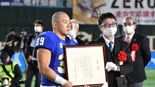 <写真・賞状を受け取る鶴留主将> 1月3日、東京ドームにて第74回ライスボウが行われた。関学は社会人王者のオービックシー…