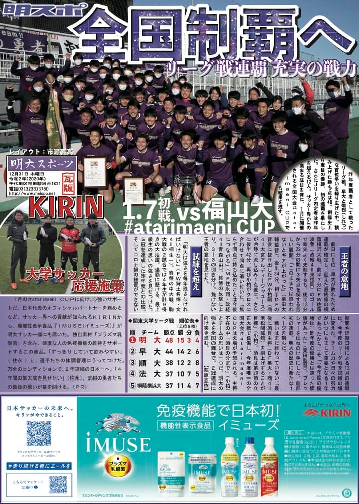 昨年度覇者として戦ったリーグ戦。早大と熾烈(しれつ)な首位争いを繰り広げた中、積み上げた勝ち点は48。創部史上6度目の優勝、初の連覇を果たした。さらにJリーグ内定者も昨年度を超える12人。サッカー界からの高まる注目を背に、1月に開催される全国大会#atarimaeni CUPでも結果を残す。