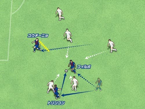 相手4人に囲まれたフィルポが、そのまま縦に突破するという選択肢はあった。しかし、コウチーニョがフィルポの右横に戻って動き直したことで、もう一度ワンツーを入れる選択肢も出た。