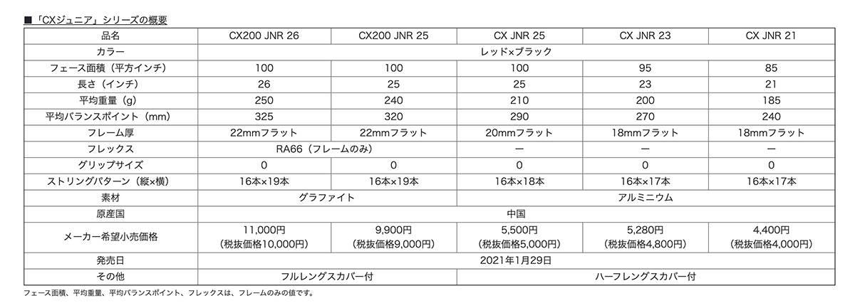 同デザインのジュニア用ラケット5機種も1月29日から販売となる。