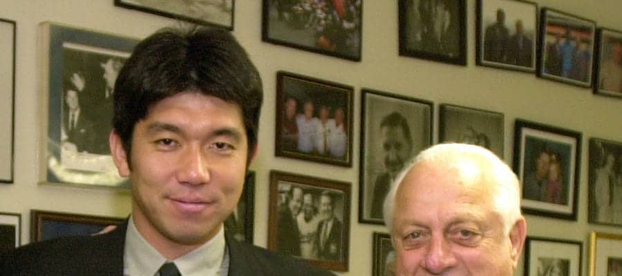 ドジャースで監督を務めたトミー・ラソーダ氏(左は野茂英雄氏)【写真:Getty Images】