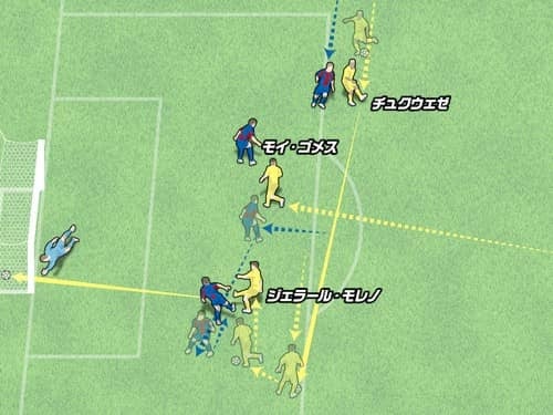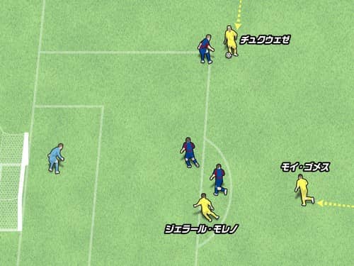 後半9分、カウンターの場面で右サイドからサムエル・チュクウェゼがカットイン。中央でジェラール・モレノが待ち、2列目からモイ・ゴメスが走り込んだ。このあとモイ・ゴメスはジェラール・モレノを生かすために、どんな囮の動きをしただろうか。