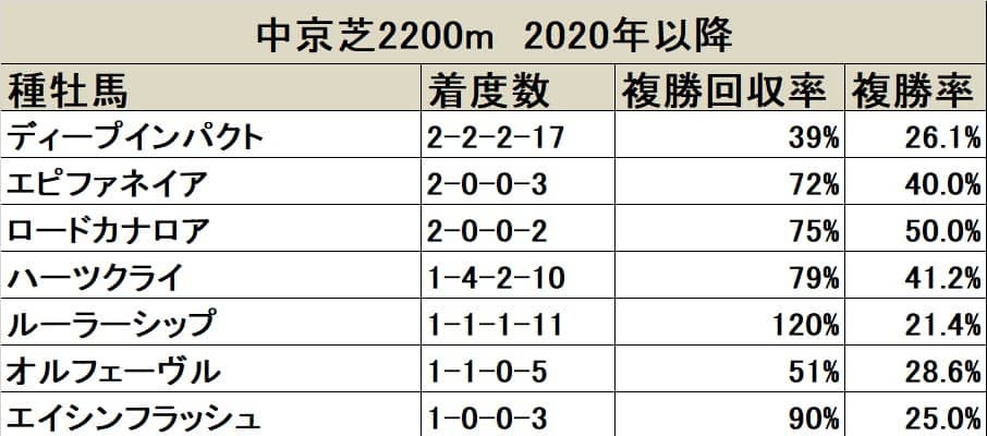 ディープインパクト産駒は「2-2-2-17」。エピファネイア、ロードカナロアと並んで2勝を挙げており、連対した4頭すべてが1人気の支持を受けていた。なお、2勝の内訳は3勝クラスのムーンライトH(アドマイヤビルゴ)、GIIの神戸新聞杯(コントレイル)となる。同産駒からはアドマイヤビルゴ、サトノインプレッサ、サトノソルタス、レクセランスの4頭が出走予定。