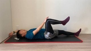 仰向けになり、右手と右膝を引き寄せ、押し合うようなイメージでお腹に市からを入れましょう。伸ばしている脚と腕は軽く浮かせます。この際、床と腰の間に隙間ができないように注意する。