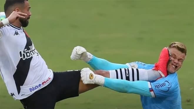 Así quedó Douglas Friedrich, arquero de #Bahía, después de que Leandro Castán del Vasco da Gama le dejara la suela un poco alta