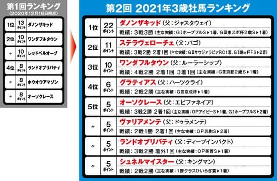 前回に引き続き1位は、ダノンザキッド。GI制覇を遂げたことで、ポイントは前回よりも大幅に伸ばしている。