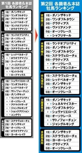 ※『Sportivaオリジナル番付』とは、デイリー馬三郎の吉田順一記者、日刊スポーツの木南友輔記者、独特なデータを駆使するパソコン競馬ライターの市丸博司氏、フリーライターの土屋真光氏、Sportiva編集部競馬班の5者それぞれが、今春のクラシックを目指す3歳牡馬の、現時点における実力・能力を分析しランク付け。さらに、そのランキングの1位を5点、2位を4点、3位を3点、4位を2点、5位を1点として、総合ポイントを集計したもの。