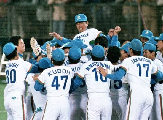 1983年、巨人を下し西武を2年連続日本一に導き、胴上げされる廣岡達朗氏