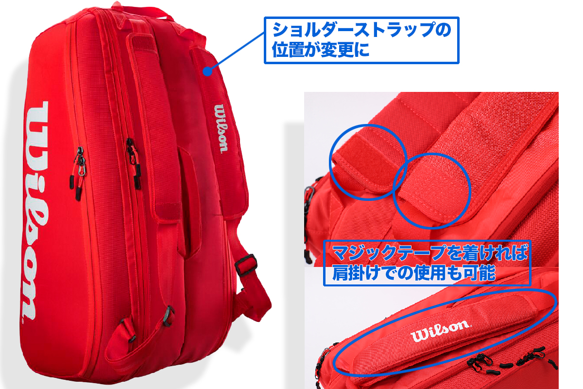 大きな変更点の一つが、「ショルダー」の位置である。これまでウイルソンのバッグのショルダーは、ファスナー側とは逆側に設置されていた。それをファスナー側に取り付けることにしたのだ。それはコートに触れる側にショルダーがあると背負った時に、背が汚れてしまうというユーザーからの意見を反映したもの。今回、両サイドの素材をより厚手のものにしたことで、背負っても形状が崩れにくくなったことから、位置の変更は実現したわけだ。また、「ショルダーパッド」には、面ファスナー(言わゆる“マジックテープ”)が施されていて、くっつけることで、肩掛け仕様にすることができる。