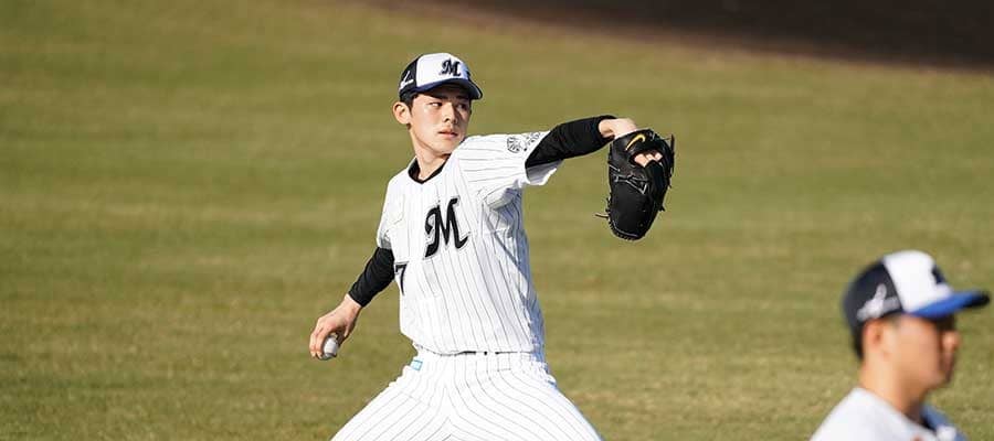 ロッテ公式ツイッターは佐々木の球を受ける新人・谷川唯人捕手の真後ろから撮影。外角へ勢いよく伸びる快速球で乾いたミット音を鳴らし、谷川も「ナイスボール! いいボール!」と称えている。