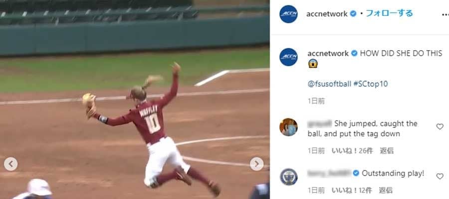 米女子ソフト選手のダイナミックなプレーが話題を呼んでいる(画像は「ACCネットワーク」公式インスタグラムより)