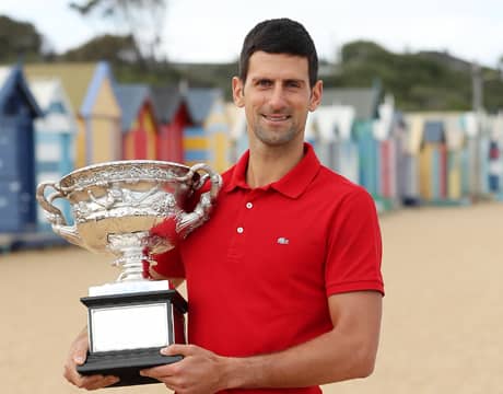 テニスの全豪オープン(オーストラリア/メルボルン、ハード、グランドスラム)の男子シングルスで、9度目の優勝を果たすとともに2度目の3連覇を達成する偉業を成し遂げた世界ランク1位のN・ジョコビッチ(セルビア)は決勝戦から一夜明けた22日、記念撮影を行った。