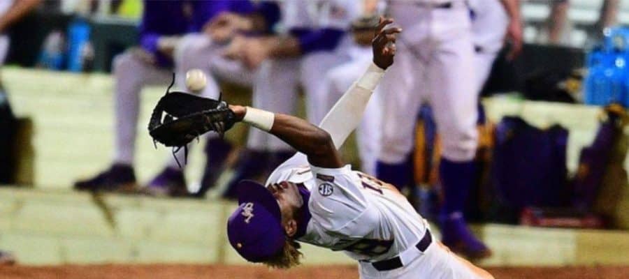 ルイジアナ州立大のトレ・モーガン一塁手が奇跡の“海老反りキャッチ”を披露 プロ野球選手でもきっと至難のワザだろう。信じら…