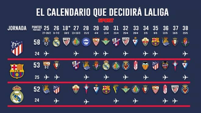 現状、レアル・マドリーは数十時間後にレアル・ソシエダとのラ・リーガ第25節を控えており、アトレティコ・マドリーはアスレティック・ビルバオとの第18節が未消化のため、2チームとも1試合バルサより少ない。そのため、暫定順位は勝ち点58のアトレティコが首位、53のバルサが2位、52のマドリーが3位となっている。
