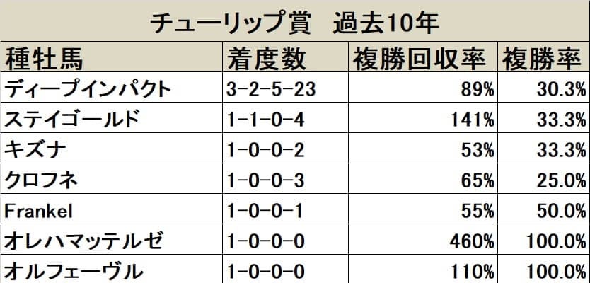 過去10年で最多となる10回の馬券絡みがディープインパクト。次点で4回のダイワメジャーが続き、3回がハーツクライ、2回がステイゴールドとなっている。