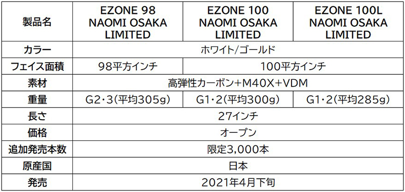 発売されるラインナップは3種類。「EZONE 98 NAOMI OSAKA LIMITED」(98平方インチ・平均305g)、「EZONE 100 NAOMI OSAKA LIMITED」(100平方インチ・平均300g)、「EZONE 100L NAOMI OSAKA LIMITED」(100平方インチ・平均285g)とそれぞれ異なるスペックとなっている。この機会にぜひ手に取ってみてはいかがだろうか。