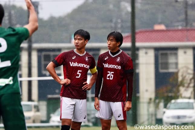 杉山耕二主将(スポ4=三菱養和SCユース)とセットプレーの確認をする鈴木