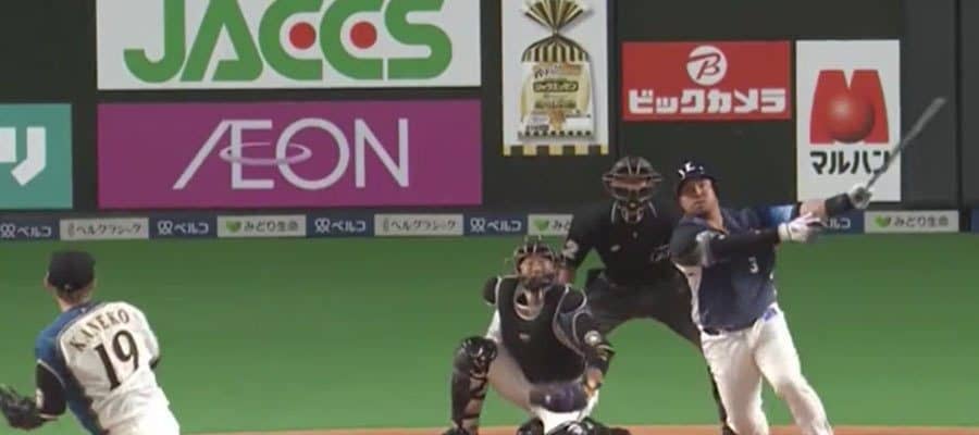 初回に森の適時二塁打で先制した直後の無死二、三塁。日本ハムの先発・金子の直球を打ち上げると、打球は6秒ほどの滞空時間をもって気がつけばバックスクリーンへ。「パーソル パ・リーグTV」の公式ツイッターは「バットの先端でも関係なし!」との言葉を添えて動画を公開した。