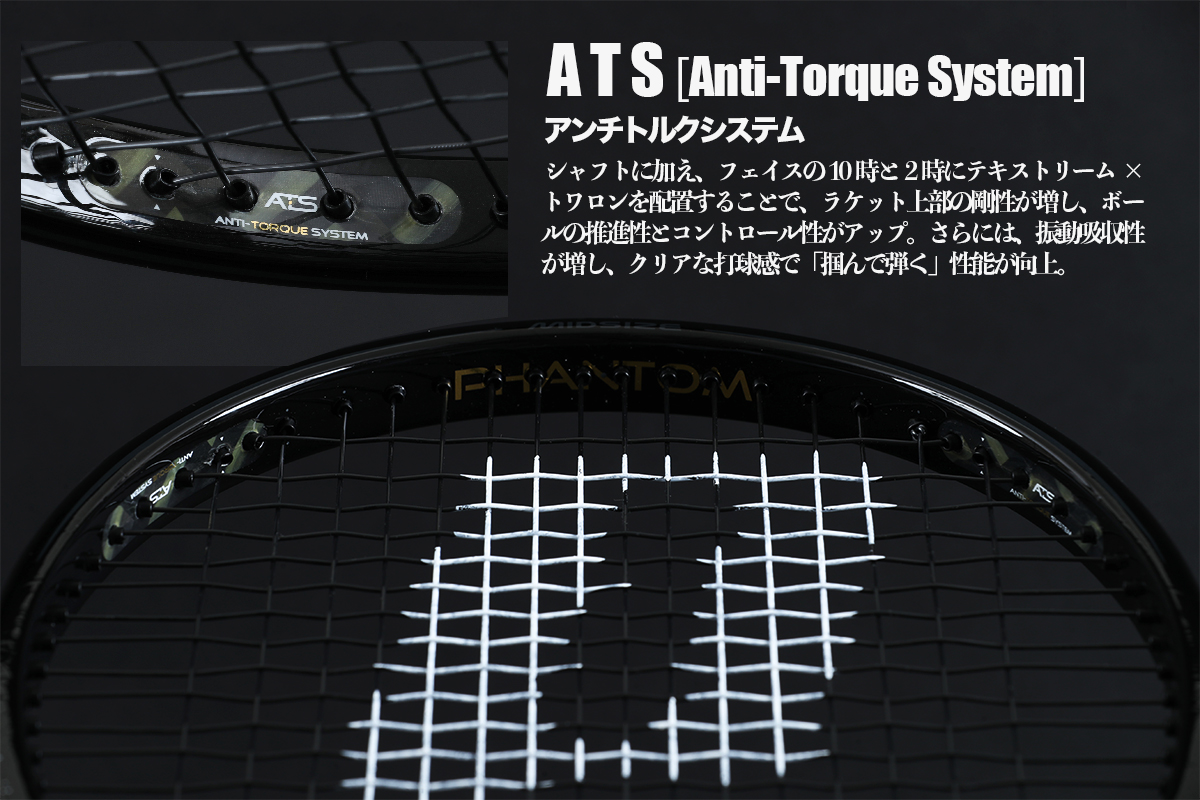 そして、この最強素材を生かすためのテクノロジーこそが「ATS(アンチトルクシステム)」テクノロジーである。シャフト部に加え、フェイス部の10時・2時部分に「テキストリーム×トワロン」素材を使用する同テクノロジーは、ラケット上部の剛性を強化し、ボールの飛び、コントロールをアップさせる。また素材と同様振動吸収性においても、大きな助けとなっている。
