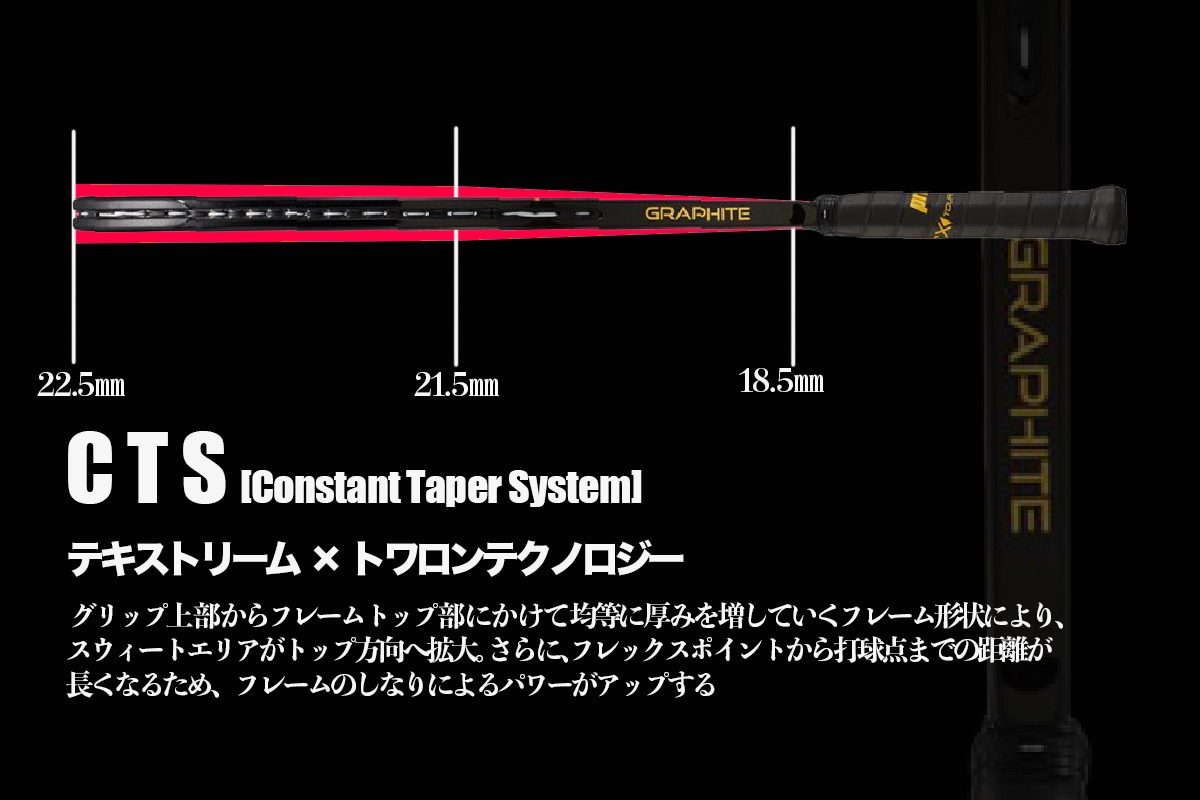 そして、97平方インチのフェイスサイズでも、しっかりとした飛びを実現するための秘密が、フレーム厚にある。「CTS(コンスタントテーパーシステム)」は、グリップ上部からフレームトップ部にかけて、均等に厚みを増していくフレーム形状のこと。フェイスのトップ部分でのパワーが増し、スイートエリアがトップ方向に広がるというメリットがある。今回の注目はその厚みにある。97平方インチモデルでは、100&107平方インチモデルより1mmずつ厚くしている。トップ部分は22.5mm(100&107平方インチモデル:21.5mm)、グリップ上部が18.5mm(同17.5mm)。わずか1mmだが、その効果は実は大きいのだ。ここは体感してみないとわからない部分かもしれない。