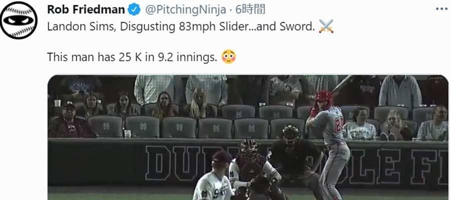 実際の動画を「ピッチングニンジャ」の愛称で知られ、現役の米大リーグ選手や米メディアからも多数フォローされている名物セレブのロブ・フリードマン氏がツイッターで公開。文面では「ランドン・シムズ、83マイル(約133キロ)のえげつないスライダー。この男、9.2イニングで25奪三振」と驚異のデータと共に紹介している。