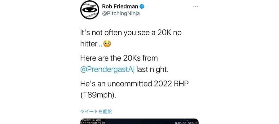 米高校生右腕の快投が現地で注目を浴びている(写真はロブ・フリードマン氏のツイッターから)