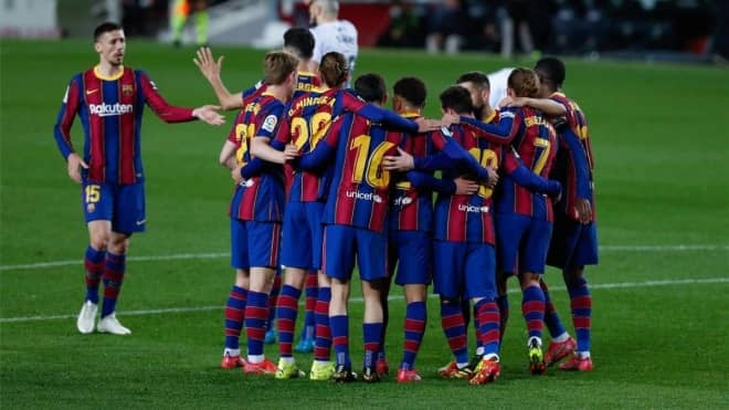 リーグ戦16試合無敗中のバルサは3バックを継続。パリ・サンジェルマン戦と同様にデ・ヨングがセンターバックの中央に配置された。ウエスカの日本代表FW岡崎慎司はベンチスタートで最後まで出場なし。