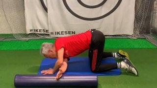 ②片方の腕を伸ばしながらストレッチポールを転がします