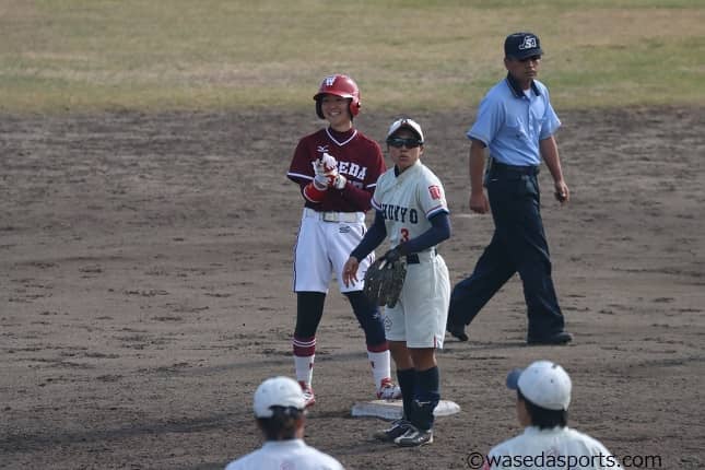 インカレで2点適時打を打ち、塁上で笑顔を見せる堀