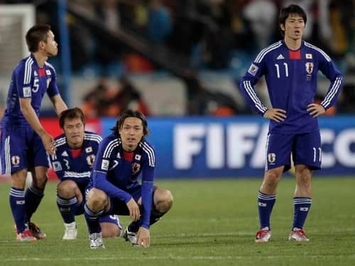 2010年南アフリカW杯でパラグアイにPK戦の末に敗れ、うつむく日本の選手たち