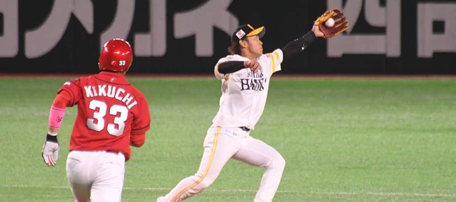 ホークスに「遊撃・今宮」が戻ってきた。この日は6回の第3打席で広島・九里から左翼線二塁打を放つと、守備では二塁ベースよりのゴロを素早く処理、三遊間のゴロに前進し二塁へクイックスローを見せるなど攻守を連発。