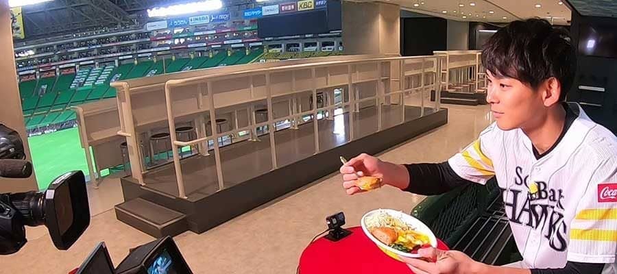 自身がプロデュースした「いずみんの金沢カレー」を告知するソフトバンク・泉圭輔【写真提供:福岡ソフトバンクホークス】