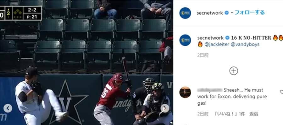 16三振を奪いノーヒットノーランを達成したジャック・ライター(画像は「SECネットワーク」公式インスタグラムより)