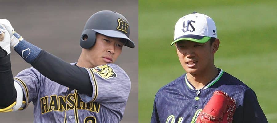 阪神・佐藤輝明(左)とヤクルト・奥川恭伸【写真:荒川祐史】