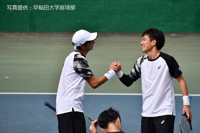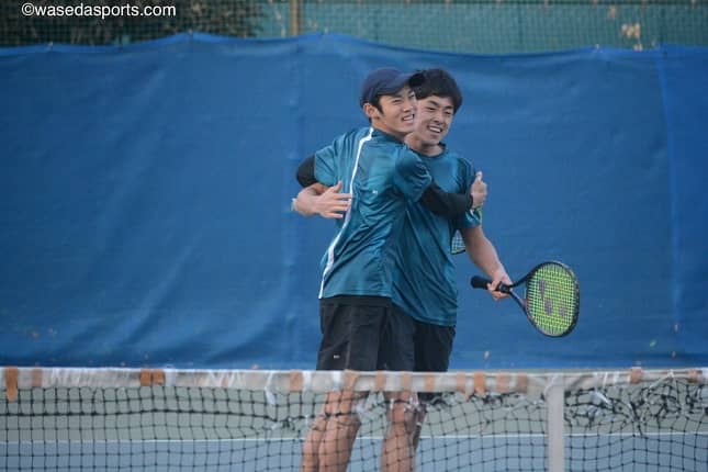 昨年の早慶戦のダブルス2に出場し、木元と手を組み合う田中