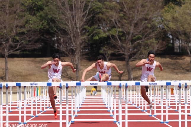 また、男女ともに好記録が続出したのが400メートル障害。山内大夢(スポ3=福島・会津)が50秒65をマークしたほか、1年生の新井公貴(スポ1=神奈川・逗子開成)と田中天智龍(スポ1=鹿児島南)がそれぞれ51秒61と51秒62でフィニッシュ。両者とも自己ベストを更新し、大学2年目のシーズンへ弾みをつけた。女子は津川瑠衣(スポ1=東京・八王子)が58秒64をマークし、川村優佳(スポ1=東京・日大桜丘)も60秒切り。早大女子障害ブロックをリードしてきた小山佳奈(スポ4=神奈川・橘)は卒業したが、関本萌香(スポ3=秋田・大館鳳鳴)や村上夏美(スポ3=千葉・成田)を含め全国トップクラスのハードラーがそろう今季も、活躍を期待せずにはいられない。