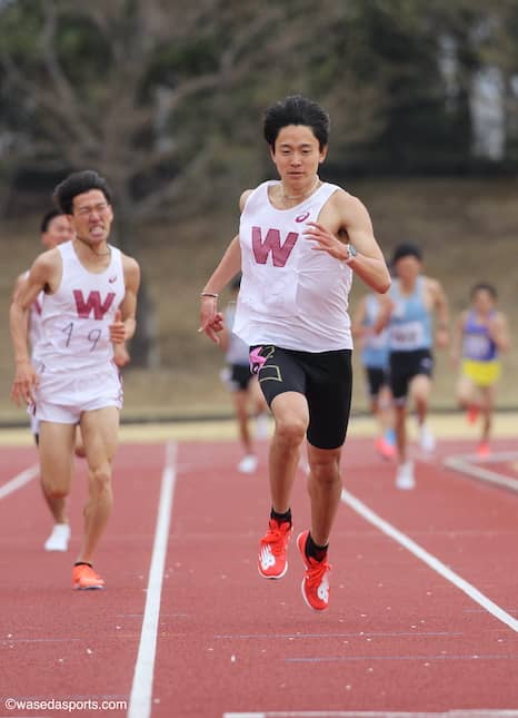2日目の3000m2組目には多くの主力選手が登場した。スタート直後の序盤から、千明駅伝主将が先頭でペースをつくるかたちに。ラスト1周の鐘が鳴ると、千明、そして「勝てるイメージを作れたらいい」との言葉通り、集団内で徐々にポジションを上げていた井川龍人(スポ2=熊本・九州学院)らが激しい勝負を繰り広げる。そしてホームストレート手前で先頭に躍り出たのは井川。向かい風が吹き荒れる中、追い込み切った井川が1着でレースを制した。また、千明に続いて4着でフィニッシュしたのは菖蒲。前日の1500mに続き、存在感を示す結果となった。今回のレースに練習の一環として出場した早大の選手たち。本格化するトラックシーズンでの躍動に向けて、それぞれ課題と手応えを得た。